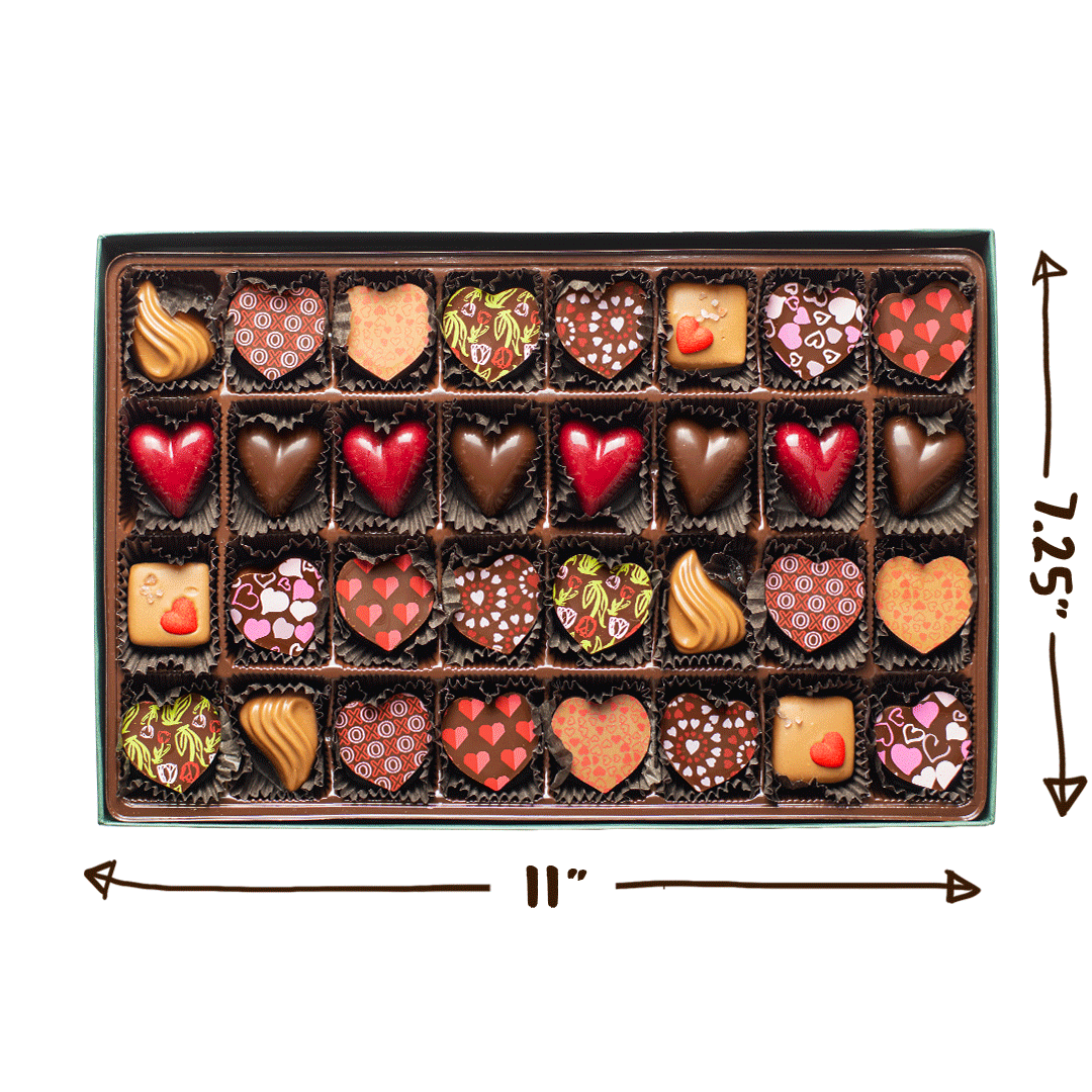 Dark chocolate, milk chocolate, cherry preserves, chocolate ganache, cookie butter, caramel, coffee, pecan and sea salt, natural flavors and cocoa butter colors.