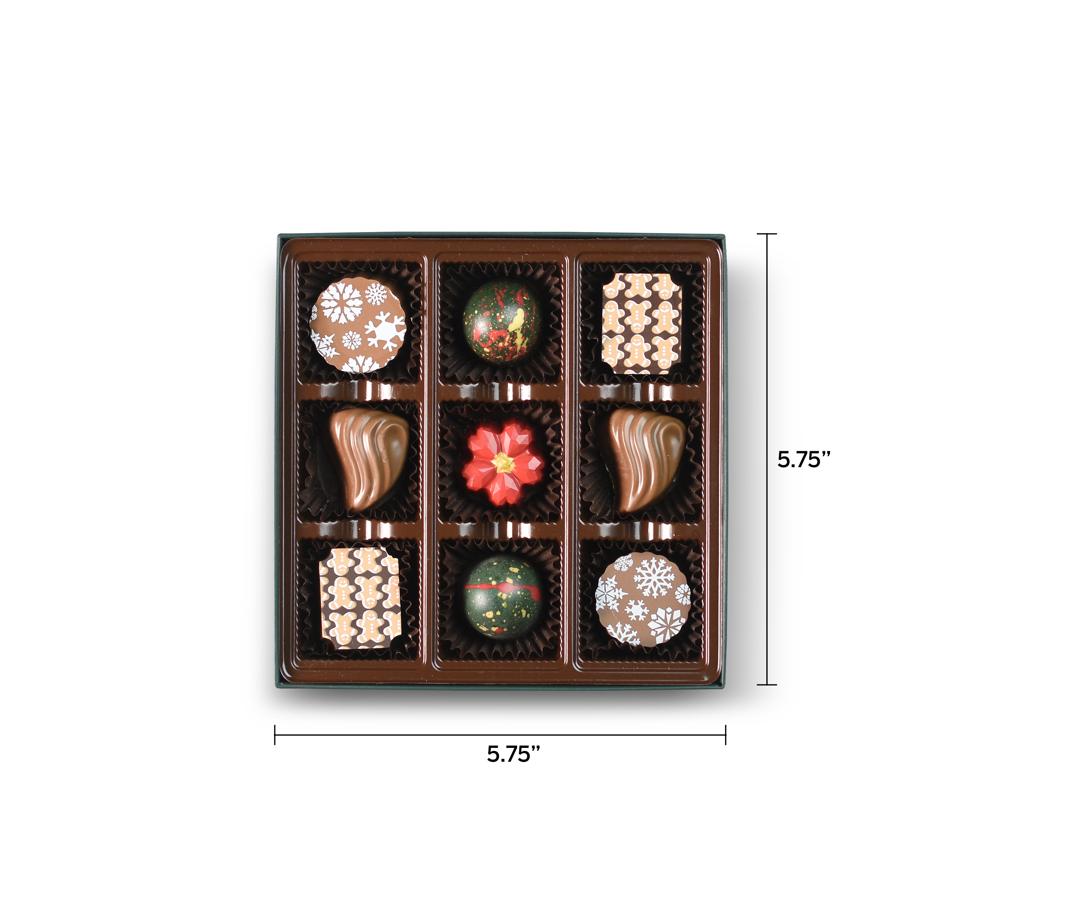 Experience the comforting flavors of the holidays with our Cozy Classics 9-Piece Box. This collection features an exquisite blend of our finest milk, white, and dark chocolate truffles, carefully selected to evoke the warmth and joy of the season. Perfect for a thoughtful gift or a personal indulgence.